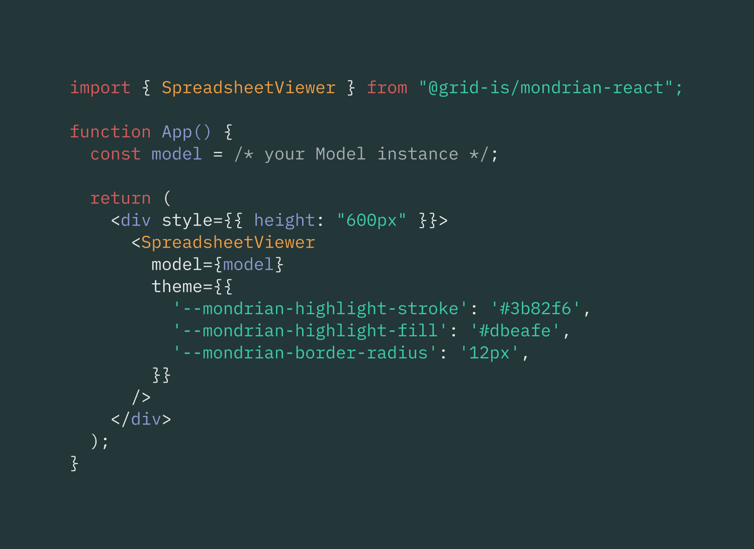 Getting started with the Mondrian Spreadsheet Viewer in React is effortless. Our mondrian-react package provides pre-built components that wrap the core spreadsheet engine, giving you a production-ready spreadsheet viewer with just a few lines of code.